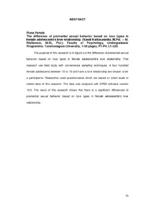 Penelitian ini bertujuan untuk melihat perbedaan perilaku seksual pranikah berdasarkan jenis cinta pada remaja putri yang berpacaran. Jenis penelitian yang dilakukan dalam penelitian ini adalah field study dengan menggunakan teknik convenience sampling. Sebanyak 400 orang remaja putri yang berusia 15-18 tahun yang sedang pacaran berpartisipasi dalam penelitian ini. Pengumpulan data penelitian dilakukan dengan menggunakan kuesioner yang disusun berdasarkan skala Likert. Data penelitian ini dianalisis dengan menggunakan Kruskal-Wallis Test dengan bantuan program SPSS versi 13.0. Hasil penelitian ini menunjukkan bahwa ada perbedaan perilaku seksual pranikah berdasarkan jenis cinta pada remaja putri yang berpacaran.