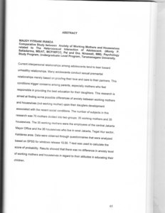 Current interpersonal relationships among adolescents tend to lean toward unhealthy relationships. Many adolescents conduct sexual premarital relationships merely based on proofing their love and care to their partners. This conditions trigger concerns among parents, especially mothers who feel responsible in providing the best education for their daughters. This research is aimed at finding some possible differences of anxiety between working mothers and housewives (not working mother) upon their daugters development associated with the recent social conditions. The number of subjects in this research was 70 mothers divided into two groups: 35 working mothers and 35 housewives. The 35 working mothers were the employees of the central Jakarta Mayor Office and the 35 housewives who live in west Jakarta, Tegal Alur sector, Kalideres area. Data were obtained through questionnaires that were analyzed based on SPSS for windows release 10.00. T-test was used to calculate the score of probability. Results showed that there was no difference in anxiety level of working mothers and housewives in regard to their attitudes in educating their children.