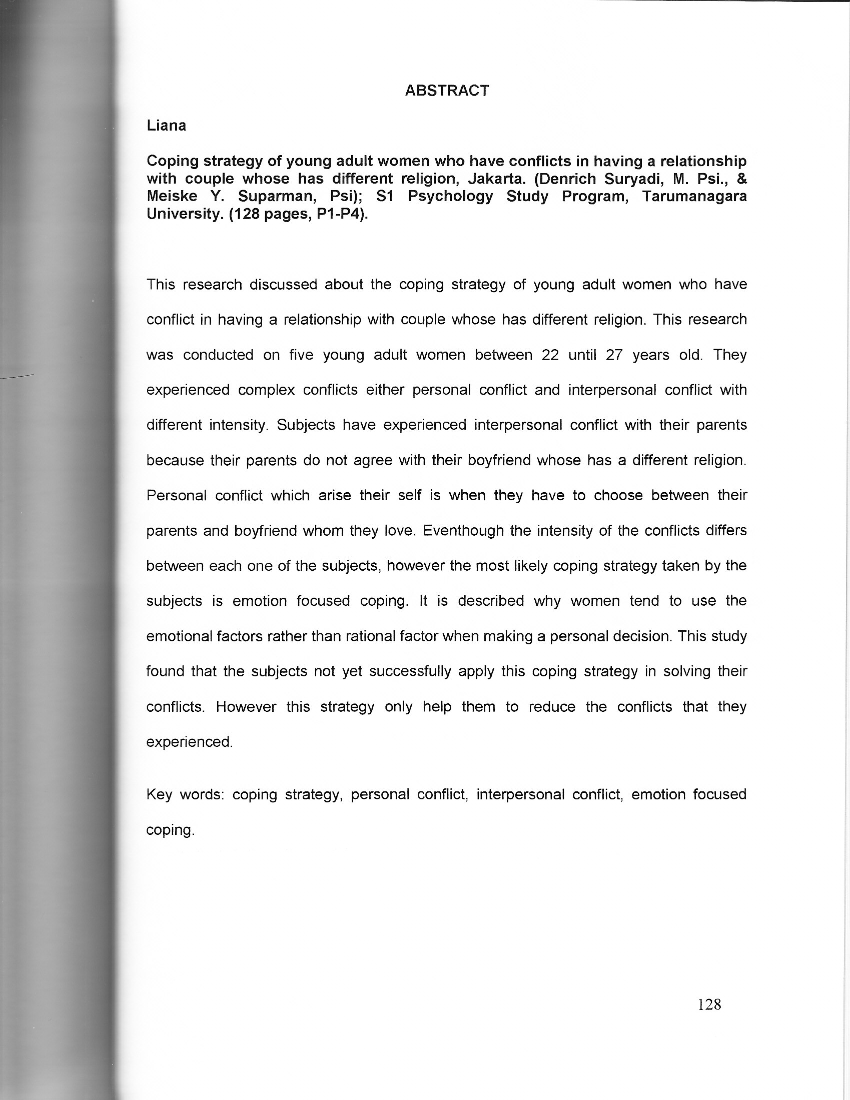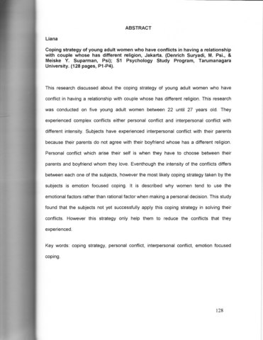 Liana, Liana (2007) Strategi Coping Pada Wanita Dewasa Muda Yang Mengalami Konflik Pacaran Beda Agama. Skripsi thesis, Universitas Tarumanagara.
