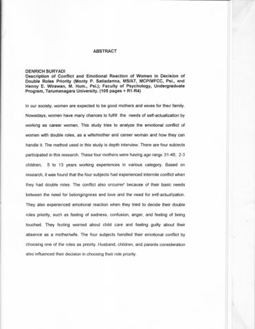 SURYADI, DENRICH (2001) Gambaran Konflik Dan Reaksi Emosional Perempuan Dalam Menentukan Prioritas Peran Gandanya. Skripsi thesis, Universitas Tarumanagara.
