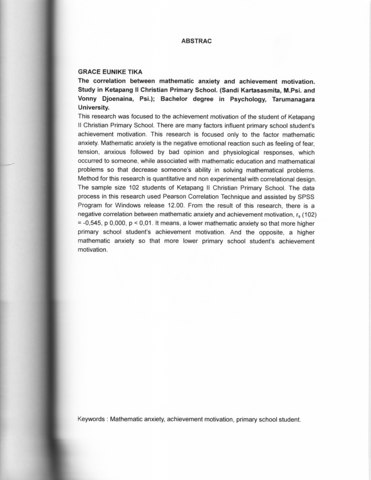 Tika, Grace Eunike (2007) Hubungan Antara Kecemasan Matematika Dengan Motivasi Berprestasi Siswa Sekolah Dasar. Studi Pada Sekolah Dasar Kristen Ketapang II. Skripsi thesis, Universitas Tarumanagara.