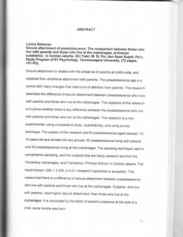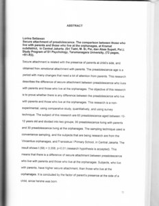 Secure attachment is related with the presence of parents at child's side, and obtained froni emotional attachment with parents. The preadolescence age is a period with many changes that need a lot of attention from parents. This research describes the difference of secure attachment between preadolescence who lives with parents and those who live at the orphanages. The objective of this research is to prove whether there is any difference between the preadolescence who live with parents and those who live at the orphanages. This research is a non-experimental, using comparative study, quantitatively, and using survey technique. The subject of this research are 60 preadolescence aged between 10- 12 years old and divided into two groups; 30 preadolescence living with parents and 30 preadolescence living at the orphanages. The sampling technique used is convenience sampling, and the subjects that are being research are from the Vincentius orphanages, and Fransiskus I Primary School, in Central Jakarta. The result shows t (58) = 3,358, p<0,01 (research hypothesis is accepted). This means that there is a difference of secure attachment between preadolescence who live with parents and those who live at the orphanages. Subjects, who live with parents, have higher secure attachment, than those who live at the orphanages. lt is concluded by the factor of parent's presence at the side of a child, since he/she was born.