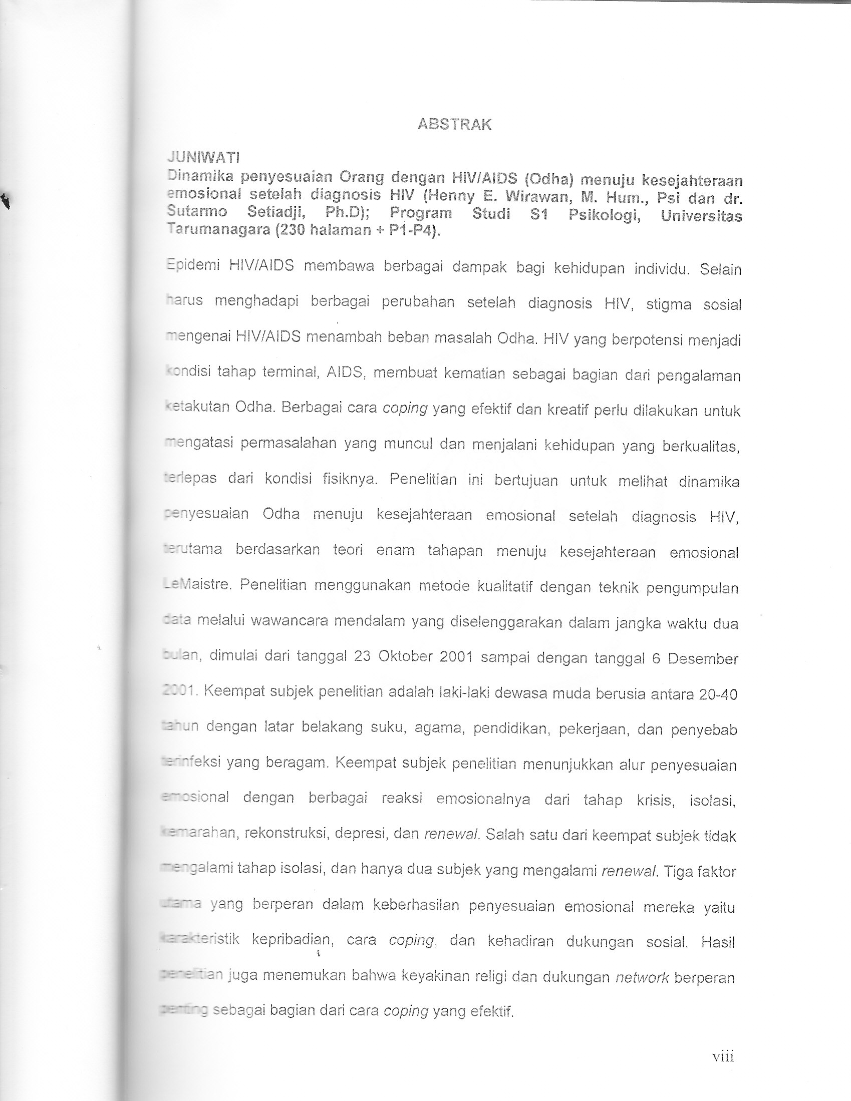 Epidemi HIV/AIDS membawa berbagai dampak bagi kehidupan indvidu. Selain harus menghadapi berbagai perubahan setelah diagnosis HIV, stigma sosial mengenai HIV/AIDS menambah beban masalah Odha. HIV yang berpotensi menjadi kondisi tahap terminal, AIDS, membuat kematian sebagai bagian dari pengalaman ketakutan Odha. Berbagai cara coping yang efektif dan kreatif perlu dulakukan untuk mengatasi permasalahan yang muncul dan menjalani kehidupan yang berkualitas, terlepas dari kondisi fisiknya. Penelitian ini bertujuan untuk melihat dinamika penyesuaian Odha menuju kesejahteraan emosional setelah diagnosis HIV, terutama berdasarkan teori enam tahapan menuju kesejahteraan emosional Lemaistre. Penelitian menggunakan metode kualitatif dengan teknik pengumpulan data melalui wawancara mendalam yang diselenggarakan dalam jangka waktu dua bulan, dimulai dari tanggal 23 Oktober 2001 sampai dengan tanggal 6 Desember 2001. Keempat subjek penelitian adalah laki-laki dewasa muda berusia 20-40 tahun dengan latar belakang suku, agama, pendidikan, pekerjaan, dan penyebab terinfeksi yang beragam. Keempat subjek penelitian menunjukkan alur penyesuaian emosional dengan berbagai reaksi emosionalnya dari tahap krisis, isolasi, kemarahan, rekonstruksi, depresi, dan renewal. Salah satu dari keempat subjek tidak mengalami tahap isolasi, dan hanya dua subjek yang mengalami renrewal. Tiga faktor utama yang berperan dalam keberhasilan penyesuaian emosional mereka yaitu karakteristik kepribadian, cara coping, dan kehadiran dukungan sosial. Hasil penelitian juga menemukan bahwa keyakinan religi dn dukungan network berperan penting sebagi bagian dari cara coping yang efektif.