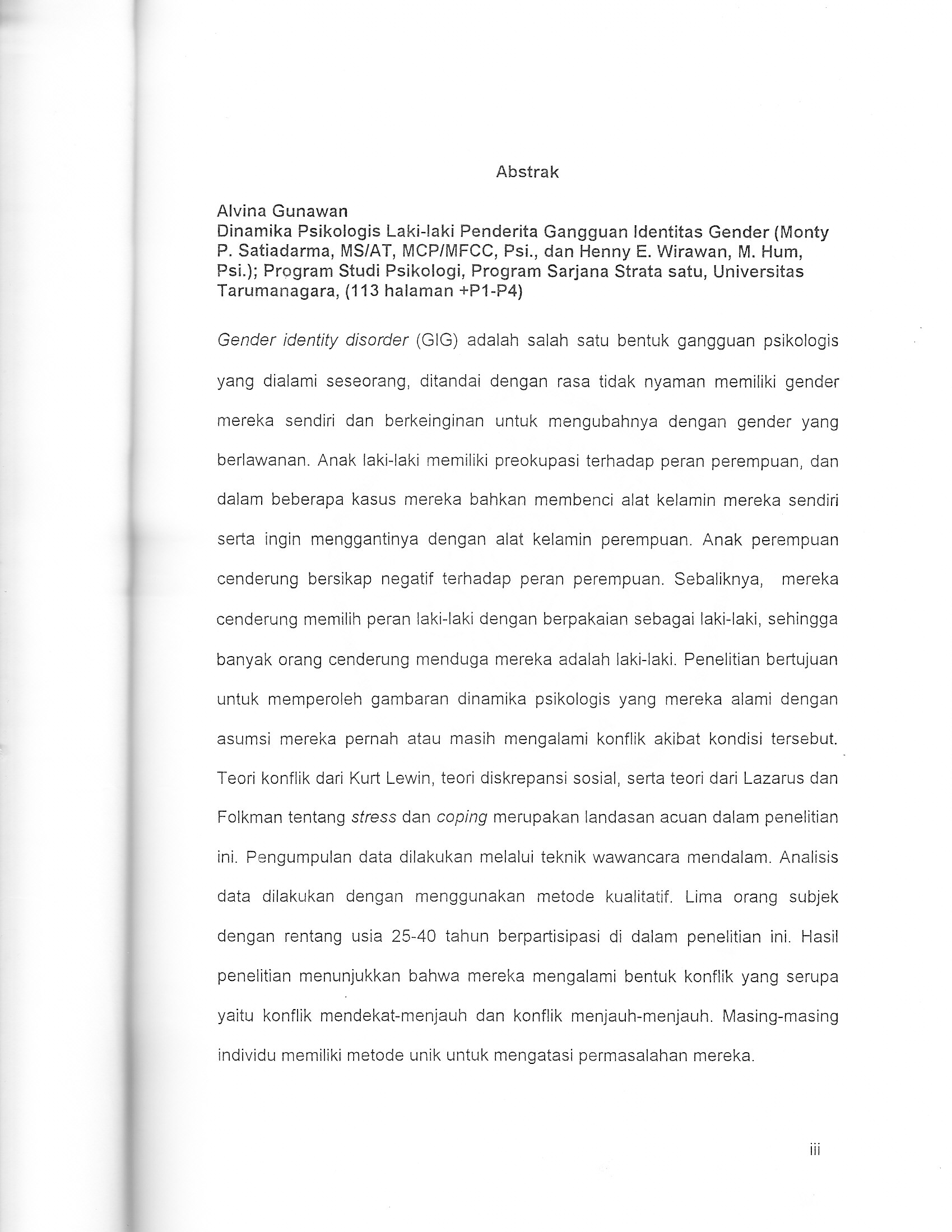 Gender identity disorder (GIG) adalah salah satu bentuk gangguan psikologis yang dialami seseorang, ditandai dengan rasa tidak nyaman memiliki gender mereka sendiri dan berkeinginan untuk mengubahnya dengan gender yang berlawanan. Anak laki-laki memiliki preokupasi terhadap peran perempuan, dan dalam beberapa kasus mereka bahkan membenci alat kelamin mereka sendiri serta ingin menggantinya dengan alat kelamin perempuan. Anak perempuan cenderung bersikap negatif terhadap peran perempuan. Sebaliknya, mereka cenderung memilih peran laki-laki dengan berpakaian sebagai laki-laki, sehingga banyak orang cenderung menduga mereka adalah laki-laki. Penelitian bertujuan untuk memperoleh gambaran dinamika psikologis yang mereka alami dengan asumsi mereka pernah atau masih mengalami konflik akibat kondisi tersebut. Teori konflik dari Kurt Lewin, teori diskrepansi sosial, serta teori dari Lazarus dan Folkman tentang stress dan coping merupakan landasan acuan dalam penelitian ini. Pengumpulan data dilakukan melalui teknik wawancara mendalam. Analisis data dilakukan dengan menggunakan metode kualitatif. Lima orang subjek dengan rentang usia 25-40 tahun berpartisipasi di dalam penelitian ini. Hashl penelitian menunjukkan bahwa mereka mengalami bentuk konflik yang serupa yaitu konflik mendekat-menjauh dan konflik menjauh-menjauh. Masing-masing individu memiliki metode unik untuk mengatasi permasalahan mereka.