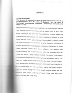 Being a physical handicapped caused by accident can bring impacts to one's life. They commonly experiece various emotional reaction, such as shock, fear, anxiety, regarding to their future life. The social stigma in society towards the physical handicapped worsening their problem. Besides the existence of social support, they also need to apply creative and effective ways of coping to handle their emotional problem. This research is aimed at discovering the dynamic of emotional in physical handicapped people and based on the theory of six stages towards emotional wellness from JoAnn LeMaistre. This research used qualitative methods with in-depth interview, which was conducted within two moths, from January 7, 2002 until March 14, 2002 The subjects in this research are two men and woman who suffered from physical handicapped, aged 20-40 years. Four subjects showed the dynamic of emotion begin with crisis, isolation, anger, resconstruction, intermittent depression, and renewal. One of them did not go through anger stage and only two of them reaced the stage of renewal. Three main factors playing role in their struggle towards renewal are self acceptance, social support, and ways of coping. These three factors help subjects to enchance their quality of life.