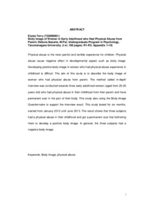 Physical abuse is the most painful and terrible experience for children. Physical abuse cause negative effect in developmental aspect such as body image. Developing positive body image in woman who had physical abuse experience in childhood is difficult. The aim of this study is to describe the body image of woman who had physical abuse from parent. The method called in-depth interview was conducted towards three early adulthood woman (aged from 20-25 years old) who had physical abuse in their childhood from their parent and have permanent scar in the part of their body. This study also using the Body Image Questionnaire to support the interview result. This study lasted for six months, started from January 2013 until June 2013. The result shows that three subjects had a physical abuse in their childhood and got a permanent scar that bothering them to develop a positive body image. In general, the three subjects had a negative body image.