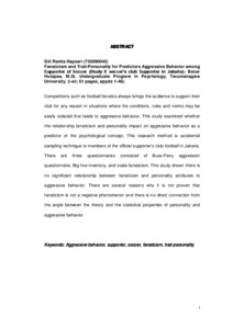 Competitions such as football fanatics always brings the audience to support their club for any reason in situations where the conditions, rules and norms may be easily violated that leads to aggressive behavior. This study examined whether the relationship fanaticism and personality impact on aggressive behavior as a predictor of the psychological concept. This research method is accidental sampling technique to members of the official supporter’s club football in Jakarta. There are three questionnaires consisted of Buss-Perry aggression questionnaire, Big five inventory, and scale fanaticism. This study shown there is no significant relationship between fanaticism and personality attributes to aggressive behavior. There are several reasons why it is not proven that fanaticism is not a negative phenomenon and there is no direct connection from the angle between the theory and the statistical properties of personality and aggressive behavior.