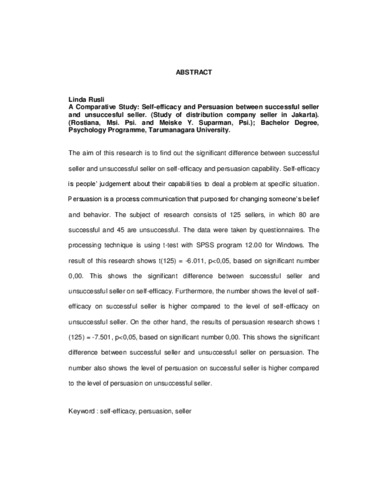 Tujuan penelitian ini adalah untuk mengetahui apakah terdapat perbedaan signifikan antara self-efficacy penjual yang sukses dan self-efficacy penjual yang gagal. Disamping itu, penelitian ini juga bertujuan untuk mengetahui apakah terdapat perbedaan signifikan antara daya persuasi penjual yang sukses dan daya persuasi penjual yang gagal. Subyek penelitian berjumlah 125 orang, yang terdiri dari 80 penjual yang sukses dan 45 penjual yang gagal. Berdasarkan hasil pengolahan data variabel self-efficacy, diperoleh nilai t(125) = -6.011, p<0,05, dengan mengacu pada nilai signifikansi 0,00. Hal ini menunjukkan adanya perbedaan yang signifikan antara self-efficacy penjual yang sukses dan self-efficacy penjual yang gagal. Hasil pengolahan data menunjukkan tingkat self-efficacy penjual yang sukses lebih tinggi dibandingkan tingkat self-efficacy penjual yang gagal. Sedangkan hasil pengolahan data variabel daya persuasi, diperoleh nilai t(125) = -7.501, p<0,05, dengan mengacu pada nilai signifikansi sebesar 0,00. Hal ini menunjukkan adanya perbedaan yang signifikan antara daya persuasi penjual yang sukses dan daya persuasi penjual yang gagal. Hasil pengolahan data menunjukkan tingkat daya persuasi penjual yang sukses lebih tinggi dibandingkan tingkat daya persuasi penjual yang gagal.