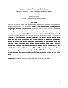 Massively Multiplayer Online Role Playing Games (MMORPGs) merupakan jenis permainan dengan jaringan internet yang memerlukan interaksi sosial. MMORPGs kini menjadi permainan yang sangat populer di kalangan remaja. Pada masa transisi ini para remaja menjadi lebih dekat dengan teman sebaya mereka. Melalui online game, remaja dapat memenuhi kebutuhan bersosialisasi mereka. Remaja yang berusia 11-20 tahun berada pada tahap identity vs identity confusion dan sedang mencari tahu identitas diri serta status sosial mereka di masyarakat. Penelitian ini mencoba melihat hubungan personality traits dengan motivasi bermain online game jenis MMORPGs pada remaja akhir. Subyek penelitian ini adalah 203 remaja yang berusia 18-22 tahun dan bermain MMORPGs. Hasil penelitian ini menunjukkan bahwa ada hubungan antara personality traits dengan motivasi bermain online game. Penelitian menemukan hubungan pada dimensi extraversion dengan motivasi relationship (r=0,266, p<0,05) dan motivasi achievement (r=0,176, p<0,05), serta hubungan pada dimensi agreeableness dengan motivasi relationship (r=0,192, p=0,006). Sementara dimensi openness, conscientiousness, dan neuroticism tidak memiliki hubungan dengan motivasi bermain online game.