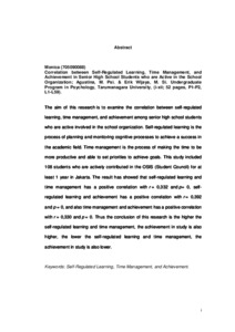 Monica, Monica (2013) Hubungan Antara Self Regulated Learning, Manajemen Waktu, Dan Prestasi Belajar Pada Siswa SMA Yang Aktif Berorganisasi. Skripsi thesis, Universitas Tarumanagara.