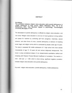 The decreased of juveni le delinquency is affected by religion value education, and vice versa. Religion value education is one tool of moral guidance to bring welfare and peace for mankind by controlling self from arrogance, meanness, asocial behavior, and other forms of crime. Juvenile delinquency is behavior of breaking social, legal, and religion norms which is conducted by people under age 18 years. The study is assessed 96 middle adolescent of Y high school who have sample characteristic of age 15 -18 years old and various religiousity backgrounds. This study is using correlational design of non eksperimental quantitative method and analyzing with Pearson Product Moment Coefficient of correlation. The results is r (94)= -.923 and p = .000, which is show strong, significant negative correlation between religion value education and juvenile delinquency .