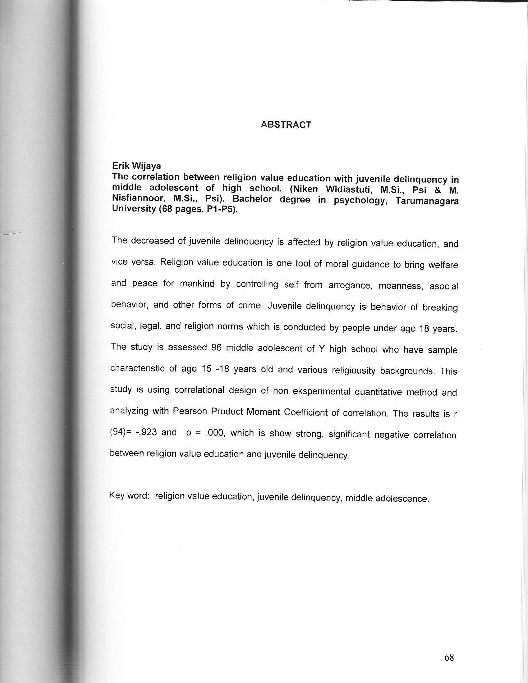 Wijaya, Erik (2007) Hubungan Antara Pendidikan Nilai Agama Dengan Perilaku Delinkuensi Pada Remaja Madya Di Sekolah Menengah Atas (SMA). Skripsi thesis, Universitas Tarumanagara.