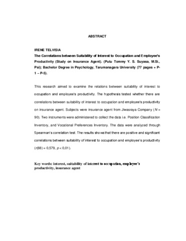 Telvisia, Irene (2007) Hubungan Antara Kesesuaian Minat Terhadap Pekerjaan Dan Produktivitas Kerja Pegawai. Studi Pada Agen Asuransi Jiwa Di Jakarta. Skripsi thesis, Universitas Tarumanagara.