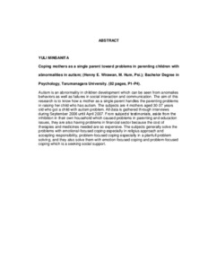 Minsanita, Yuli (2007) Coping Pada Ibu Sebagai Orangtua Tunggal Terhadap Permasalahan Dalam Pengasuhan Anak Penyandang Autisme. Skripsi thesis, Universitas Tarumanagara.