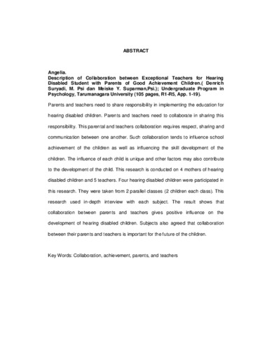 Angelia, Angelia (2007) Gambaran Kolaborasi Antara Guru Sekolah Luar Biasa Bagian B (Tuna Rungu) Dengan Orangtua Murid Yang Berprestasi. Skripsi thesis, Universitas Tarumanagara.