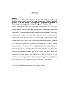 Pendidikan anak tuna rungu adalah tanggung jawab bersama antara orangtua dan guru. Salah satu cara untuk mengoptimalkan pendidikan yang diterima anak tuna rungu adalah dengan kolaborasi antara guru dan orangtua. Dalam kolaborasi, orangtua dan guru dituntut untuk menjadi rekan kerja yang saling menghargai, saling berbagi, dan mengutamakan komunikasi. Kolaborasi dapat meningkatkan prestasi anak di sekolah dan mengembangkan keterampilan anak. Kolaborasi yang terjadi pada setiap subyek penelitian tidak dapat disamakan, karena ada banyak faktor yang mempengaruhi. Subyek penelitian adalah empat orang ibu dari anak tuna rungu yang berprestasi dan lima orang guru yang bertanggung jawab untuk mendidik empat anak mereka. Empat orang anak berprestasi diambil dari dua kelas yang paralel dengan masing-masing kelas dua anak. Penelitian ini menggunakan teknik in-depth interview pada masing-masing subyek. Hasil dari penelitian ini menunjukkan terjadinya kolaborasi antara guru dan orangtua yang sungguh memberikan pengaruh bagi perkembangan anak tuna rungu. Seluruh subyek dalam penelitian juga mengakui bahwa kolaborasi penting demi masa depan anak.