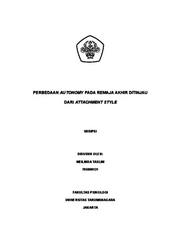Taslim, Meilinda (2013) Perbedaan Autonomy Pada Remaja Akhir Ditinjau Dari Attachment Style. Skripsi thesis, Universitas Tarumanagara.