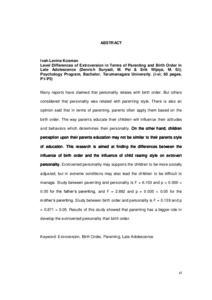 Many reports have claimed that personality relates with birth order. But others considered that personality was related with parenting style. There is also an opinion said that in terms of parenting, parents often apply them based on the birth order. The way parents educate their children will influence their attitudes and behaviors which determines their personality. On the other hand, children perception upon their parents education may not be similar to their parents style of education. This research is aimed at finding the differences between the influence of birth order and the influence of child rearing style on extrovert personality. Extroverted personality may supports the children to be more socially adjusted, but in extreme conditions may also lead the children to be difficult to manage. Study between parenting and personality is F = 6.103 and p = 0.000 < 0.05 for the father’s parenting, and F = 2.892 and p = 0.035 < 0.05 for the mother’s parenting. Study between birth order and personality is F = 0.139 and p = 0.871 > 0.05. Results of this study showed that parenting has a bigger role in develop the extroverted personality than birth order.