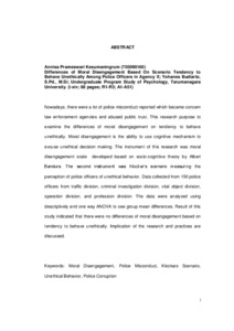 Nowadays, there were a lot of police misconduct reported which became concern law enforcement agencies and abused public trust. This research purpose to examine the differences of moral disengagement on tendency to behave unethically. Moral disengagement is the ability to use cognitive mechanism to excuse unethical decision making. The instrument of this research was moral disengagement scale developed based on socio-cognitive theory by Albert Bandura. The second instrument was Klockar’s scenario measuring the perception of police officers of unethical behavior. Data collected from 150 police officers from traffic division, criminal investigation division, vital object division, operation division, and profession division. The data were analyzed using descriptively and one way ANOVA to see group mean differences. Result of this study indicated that there were no differences of moral disengagement based on tendency to behave unethically. Implication of the research and practices are discussed.