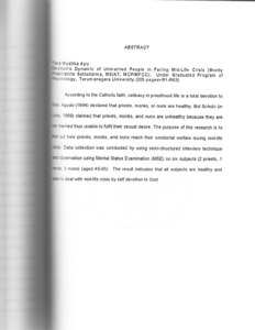 According to the Catholic faith; celibacy in priesthood life is a total devotion to God. Agudo (1994) declared that priests, monks, or nuns are healthy. But Schutls (in Looy, 1996) Claimed that priests, monks and nuns are unhelathy because they are not married thus unable to fulfil their sexual desire. The purpose of this research is to find out hhow priests, monks, and nuns their emotional welfare during mid-life crisis. Data collection was conducted by using semi-structured interview technique and observation using Mental Status Examination (MSE) on six subjects (2 priests, 1 monk, 3 nuns) (age 10-65). The result indicates that all subjects are healthy and able to deal with mid-life crisis by self devotion to God.