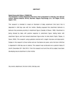 This research is intended to reveal an illustration of baby attachment (first born) that is deposited in child day care with her mother. Bowlby proposed that attachment behavior is behavior that promotes proximity to attachment figure (Cassidy & Shaver, 1999). Attachment is being showed by baby with positive response to attachment figure, feeling better with attachment figure, and look forward attachment figure when he feel afraid (Taylor, Peplau, & Sears, 2009). This research using qualitative method with in-depth interview and observation. Subject in this research is three mother and son that below one years, and a first born child that is deposited in child day care at Jakarta. This research was conducted over a period of about 6 month (December 2011-Mei 2012). From this research we found that all the subject have been developing secure attachment to their mother.