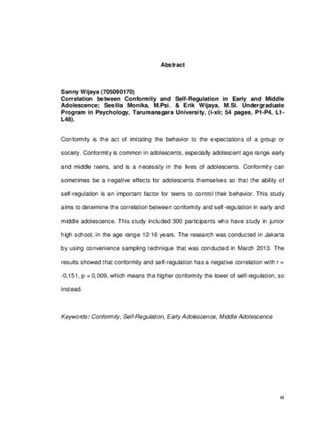 Conformity is the act of imitating the behavior to the expectations of a group or society. Conformity is common in adolescents, especially adolescent age range early and middle teens, and is a necessity in the lives of adolescents. Conformity can sometimes be a negative effects for adolescents themselves so that the ability of self-regulation is an important factor for teens to control their behavior. This study aims to determine the correlation between conformity and self-regulation in early and middle adolescence. This study included 300 participants who have study in junior high school, in the age range 12-16 years. The research was conducted in Jakarta by using convenience sampling technique that was conducted in March 2013. The results showed that conformity and self-regulation has a negative correlation with r = -0,151, p = 0,009, which means the higher conformity the lower of self-regulation, so instead.