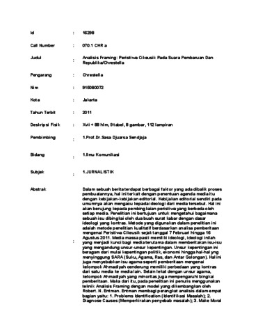 Chrestella, Chrestella (2011) Analisis Framing: Peristiwa Cikeusik Pada Suara Pembaruan Dan Republika. Skripsi thesis, Universitas Tarumanagara.
