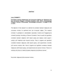 The objective of this research is to identify the correlation between religiousity and conversion motives for adulthood who has conversion religion. This research encloses 41 participants in Jabodetabek, expecially in Jakarta and Tanggerang by snowball sampling. According to Pearson Correlation, there is positif and significant correlation between religiosity (faith based coping and religious social support / activity) and intelektual also mystical motives. There is negative and significant correlation between religiousity (faith based coping ) and experimental, revivalist, and coercive motives. Also, there is negative and significant correlation between religiousity (faith based coping ) and experimental and coercive motives. There is no evidence that there is a relation between religiousity and affective motives.