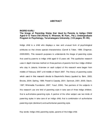 Karli, Ingrid (2007) Gambaran Parenting Styles Yang Digunakan Oleh Orangtua Kepada Anak Indigo Berusia 6-12 Tahun. Skripsi thesis, Universitas Tarumanagara.