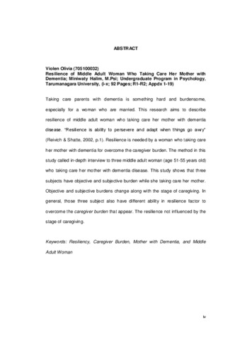 Olivia, Violen (2014) Gambaran Resiliensi Pada Perempuan Dewasa Madya Yang Merawat Ibunya Dengan di Demensia. Skripsi thesis, Universitas Tarumanagara.