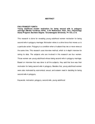 Yunita, Fika Frahesti (2007) Motivasi Wanita Dewasa Muda Untuk Menjadi Isteri Kedua Dalam Pernikahan Poligini. Skripsi thesis, Universitas Tarumanagara.