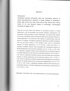 There are so many factors that influence in consumptive behavior in female adolescents. If can be personality, self concept, motivation, advertisement, and social class. Traitspersonality is a part of personality . The Aimed of this research is to find out coffelations between traits personality and consumptive behavior on female adolescents. The instrument in this research is questionnaires, which are given to 141 subjeds. The data are analyzed by Spearman 's multiple coffelations and one way anova method. In this research, mean score in consumptive behavior for female adolescents is 2.57 (s=0,35). It shows that thereis a significant coffelation between traits personality and consumptive behavior on female adolescents at sub dimension aesthetics, {3 (141)= -0.156, p < 0,05. There is a significant coffelation between traits personality and consumptive behavior on female adolescents at sub dimension excitement seeking, {3 (141)= 0.408, p < 0,05. There is a significant correlation between traits personality and consumptive behavior on female adolescents at sub dimension activity f3 (141)= -0.156, p < 0,05. There is a significant COffelation between traits personality and consumptive behavior on female adolescents at sub dimension agreeableness, nilai {3 {141) = -0.179, p < 0,05, Thereis a significant COffelation between traits personality and consumptive behavior on female adolescents at sub dimension impulsiveness, {3 (141)= 0.405, p < 0,05.