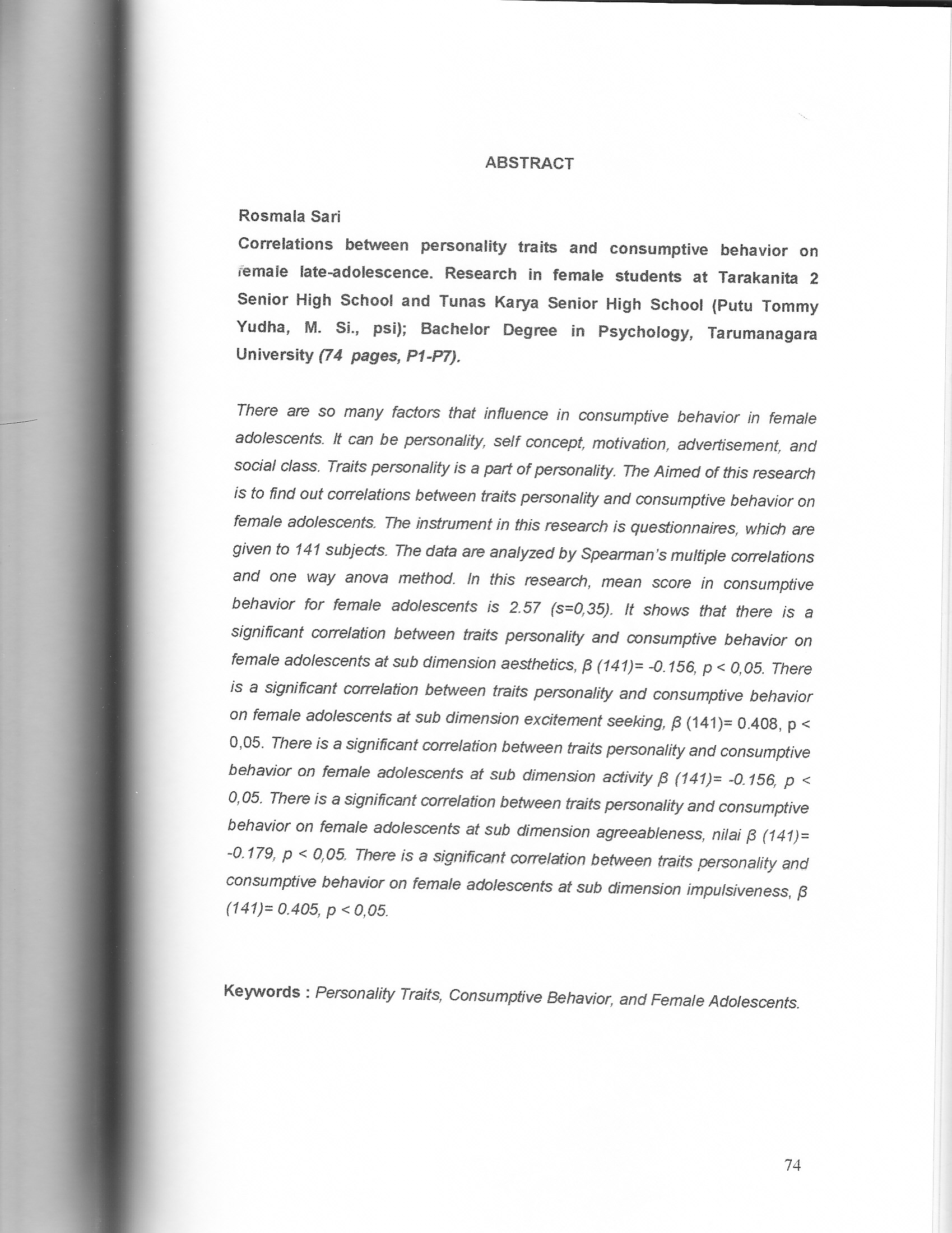 Sari, Rosmala (2007) Hubungan Antara Trait Kepribadian Dan Perilaku Konsumtif Pada Remaja Putri (Studi Kasus Pada Siswi SMU Tarakanita II Dan SMU Tunas Karya). Skripsi thesis, Universitas Tarumanagara.