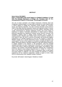 The aim of Study orientation and College Introduction (Orientasi Studi dan Pengenalan Kampus/Ospek) is to give early introduction for new students about a various aspects of college life. Orientation activity divided into university, faculty, and majoring orientation. The main university orientation activity which is held for three days would be extended in faculty and majoring for about 3 months or 1 year and should be attended by all of the new students. Orientation activity usually characterized by mentally challenging activitiy and strong stigma of harshness or violence. Orientation phenomenon is called hazing or bullying. Bullying is described as an oppression, bullying, hazing, extortion, exclusion, and intimidation. Bullying which is happen during orientation tend to valued as stressful situation, therefore each student have to have resilience. Resilience is one’s ability to deal with and to overcome life stressor and perceiving negative experiences as a valuable experience so that one can change to a better life. Resilient people has a several determining factors, included self-esteem and social support. The aim of this research is to examine the significant effect of self-esteem and social support to student’s resilience to deal with bullying experience in college. Sample in this research is 180 participants, using the snowball sampling technique and given measurement instrument such as questionnaires using a Likert scale to measure self-esteem, social support, and resilience. Data analysis in this research using Multiple Regression Analysis with a significance level 0.05. Based on data analysis obtained score R = 0,669, R2 = 0,448. The result of this research concluded that there is a significant effect of self-esteem and social support to resilience. The result showed the proportion of variance explained by all the resilience independent variable is equal to 44.8%, while 55.2% is influenced by other variables outside of research.