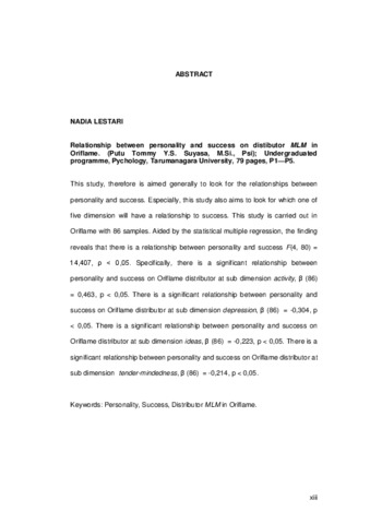 Penelitian ini secara umum bertujuan untuk mengetahui hubungan antara kepribadian dan kesuksesan. Namun secara khusus, penelitian ini bertujuan untuk mengetahui dari kelima dimensi big five personality, dimensi mana yang memiliki hubungan terhadap kesuksesan. Penelitian ini diadakan di Perusahaan Oriflame dengan sampel sebanyak 86 orang. Menggunakan perhitungan statistik regresi berganda, diperoleh hasil penelitian bahwa kepribadian berhubungan dengan kesuksesan F(4, 80) = 14,407, ρ < 0,05. Namun, secara spesifik, terdapat hubungan yang signifikan antara kepribadian dengan kesuksesan terhadap distributor Oriflame pada sub dimensi activity, β (86) = 0,463, p < 0,05. Terdapat hubungan yang signifikan antara kepribadian dengan kesuksesan terhadap distributor Oriflame pada sub dimensi depression, β (86) = -0,304, p < 0,05. Terdapat hubungan yang signifikan antara kepribadian dengan kesuksesan terhadap distributor Oriflame pada sub dimensi ideas, β (86) = -0,223, p < 0,05. Terdapat hubungan yang signifikan antara kepribadian dengan kesuksesan terhadap distributor Oriflame pada sub dimensi tender-mindedness, β (86) = -0,214, p < 0,05.
