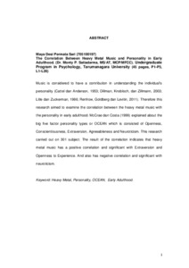 Music is considered to have a contribution in understanding the individual’s personality (Cattel dan Anderson, 1953; Dillman, Knobloch, dan Zillmann, 2003; Litle dan Zuckerman, 1986; Renfrow, Goldberg dan Levitin, 2011). Therefore this research aimed to examine the correlation between the heavy metal music with the personality in early adulthood. McCrae dan Costa (1999) explained about the big five factor personality types or OCEAN which is consisted of Openness, Conscientiousness, Extraversion, Agreeableness and Neuroticism. This research carried out on 301 subject. The result of the correlation indicates that heavy metal music has a positive correlation and significant with Extraversion and Openness to Experience. And also has negative correlation and significant with neuroticism.