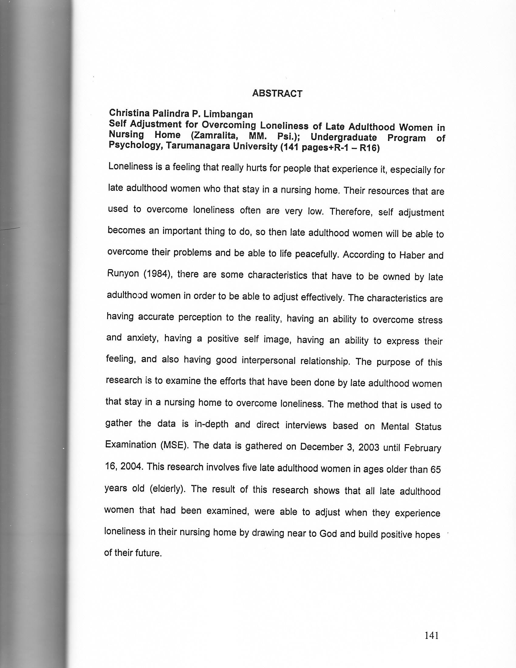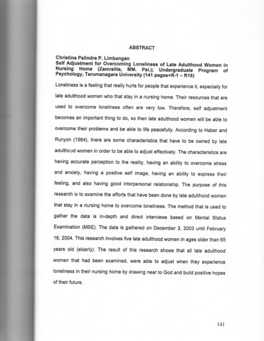 Loneliness is a feeling that really hurts for people that experience it, especially for late adulthood women who that stay in a nursing home. Their resources that are used to overcome loneliness often are very low. Therefore , self adjustment becomes an important thing to do, so then late adulthood women will be able to overcome their problems and be able to life peacefully. According to Haber and Runyon (1984), there are some characteristics that have to be owned by late adulthood women in order to be able to adjust effectively. The characteristics are having accurate perception to the reality, having an ability to overcome stress and anxiety, having a positive self image, having an ability to express their feeling, and also having good interpersonal relationship. The purpose of this research is to examine the efforts that have been done by late adulthood women that stay in a nursing home to overcome loneliness. The method that is used to gather the data is in-depth and direct interviews based on Mental Status Examination (MSE). The data is gathered on December 3, 2003 until February 16, 2004. This research involves five late adulthood women in ages older than 65 years old (elderly). The result of this research shows that all late adulthood women that had been examined, were able to adjust when they experience loneliness in their nursing home by drawing near to God and build positive hopes of their future.