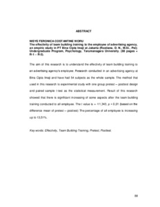 Woru, Nisye Feronica Constantine (2007) Efektivitas Pelatian Tema Building Pada Karyawan Perusahaan Periklanan. (Suatu Studi Empirik Di PT Bina Cipta Imaji Di Jakarta). Skripsi thesis, Universitas Tarumanagara.