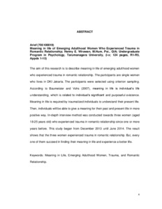 The aim of this research is to describe meaning in life of emerging adulthood women who experienced trauma in romantic relationship. The participants are single women who lives in DKI Jakarta. The participants were selected using criterion sampling. According to Baumeister and Vohs (2007), meaning in life is individual’s life understanding, which is related to individual’s significant and purposeful existence. Meaning in life is required by traumatized individuals to understand their present life. Then, individuals will be able to give a meaning for their past and present life in more positive way. In-depth interview method was conducted towards three women (aged 18-25 years old) who experienced trauma in romantic relationship since one or more years before. This study began from December 2013 until June 2014. The result shows that the three women experienced trauma in romantic relationship. But, every one of them succeed in finding their meaning in life and experience a better life.