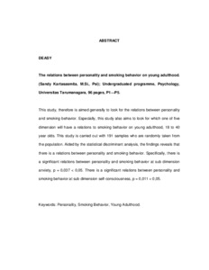 This study, therefore is aimed generally to look for the relations between personality and smoking behavior. Especially, this study also aims to look for which one of five dimension will have a relations to smoking behavior on young adulthood, 18 to 40 year olds. This study is carried out with 191 samples who are randomly taken from the population. Aided by the statistical discriminant analysis, the findings reveals that there is a relations between personality and smoking behavior. Specifically, there is a significant relations between personality and smoking behavior at sub dimension anxiety, p = 0,037 < 0,05. There is a significant relations between personality and smoking behavior at sub dimension self-consciousness, p = 0,011 < 0,05.